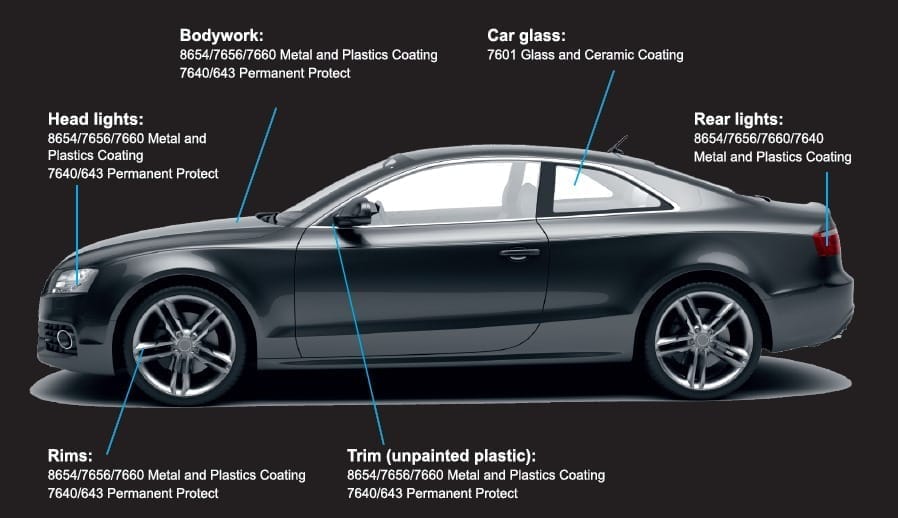 643 Dura Easy On is the latest generation of ceramic coatings – This coating provides high water and dirt repellency, combined with high resistance to mechanical wear on synthetic and metallic surfaces.